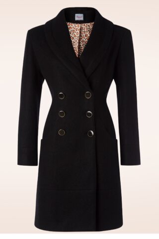 ‘Rock’ de koudere dagen met deze Rocking Coat in Black! Klassiek met een mod knipoog: dit rechte stijltje heeft een brede ronde kraag, steekzakken en opvallende grote knopen. Uitgevoerd in een stevige maar zachte, zwarte stof met een vleugje wol die je heerlijk warm houdt en geheel gevoerd met een satijnachtig leopard stofje. ”This coat rocks, so do you! ;-)”   * Recht model * Gevoerd * Ronde kraag * Lange mouwen * Dubbele reeks goudkleurige knopen * Steekzakken * Valt bij een lengte van 1,70 m op de knie