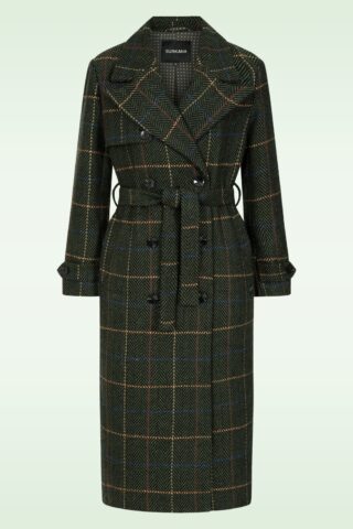 “Structured herringbone, check-print charm… trenchcoat style redefined.” Deze lange jas in trenchcoat stijl is uitgevoerd in een zware kwaliteit, kakigroene stofmix met wol (stretcht niet!), voorzien van een visgraatmotief en ruitjes in geel, blauw, bruin en zwart. Bovendien is ze volledig gevoerd met een satijnachtig stofje voor extra draagcomfort. * Trenchcoat stijl * Puntige reverskraag * Gevoerd * It has pockets! * Afneembare strikband voor een extra ‘snatched’ taille * Dubbele knopenreeks * Split achterzijde * Valt bij een lengte van 1,70 m over de knie