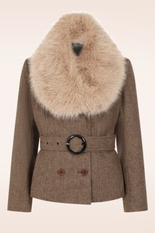 ”Life is short. Buy the coat!” Taylor heeft een stijlvolle revers kraag met afneembaar imitatiebont, lange mouwen en een prachtige dubbele knopenrij. Ze is uitgevoerd in een stevige, bruine geruite wolmix (stretcht niet) en is volledig gevoerd. * Licht getailleerd * Afneembare (beige) kraag van imitatiebont  * Lange mouwen * Afneembare riem voor een extra ‘snatched’ taille * Dubbele knopenrij * Voorzien van zakken! * Gevoerd in een satijn-achtig stofje * Exclusief bij Topvintage verkrijgbaar