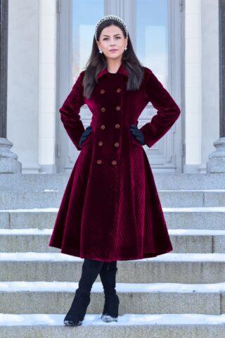 ”Embraced in velvet and bordeaux – a coat of timeless desire!” Deze Mae swing jas is exclusief bij Topvintage verkrijgbaar en niet alleen prachtig om te zien, maar houd je ook nog eens heerlijk warm tijdens de koude dagen! Ze heeft een dubbele knopenrij, handige zakken aan de voorzijde en is uitgevoerd in een zachte, gewatteerde bordeauxrode stof met de look and feel van luxe fluweel (stretcht amper) en is volledig gevoerd voor extra comfort.  * Swing model * Dubbele knopenrij * Geheel gevoerd * Voorzien van zakken! * Valt bij een lengte van 1,70 m over de knie * Exclusief bij Topvintage verkrijgbaar