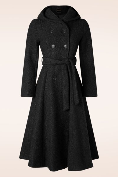 ”The perfect addition to your winter wardrobe!” Anna is niet alleen prachtig om te zien, maar ze houdt je ook nog eens heerlijk warm! Ze is uitgevoerd in een luxueuze, ietwat dikkere en zachte, zwart bouclé stofje (stretcht niet) en is volledig gevoerd voor extra comfort. * Swing model * Vaste capuchon * Dubbele knopenrij * Geheel gevoerd * Voorzien van zakken!  * Afneembaar striklint voor een ‘snatched’ taille * Gorgeous influencer Mina Mahta is 1,70 m: haar accessoires en pumps zijn haar eigen vintage treasures * Exclusief bij Topvintage verkrijgbaar