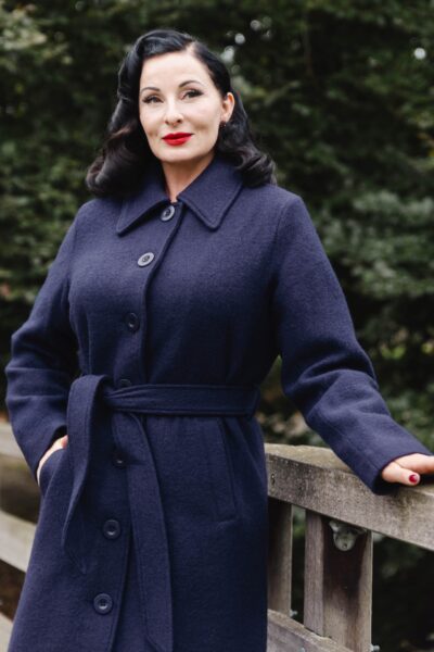 ”Meet me under the falling leaves!” Deze lange mantel is niet alleen prachtig om te zien, maar houdt je ook nog eens heerlijk warm omdat ze is uitgevoerd in een hoge kwaliteit, 100% wol (stretcht niet) in donkerblauw en tevens volledig is gevoerd met een gestreept satijnachtig stofje. * Gevoerd * Puntige kraag * Knopenrij * Afneembare strikband voor extra ‘snatched’ taille * Voorzien van zakken! * Ava is 1,69 m  * Valt over de knie bij een lengte van 1,70 m