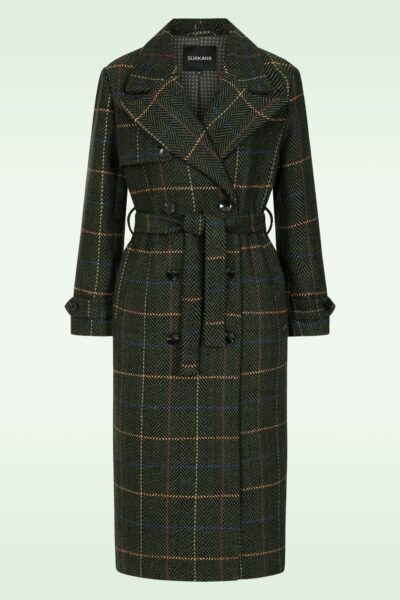 “Structured herringbone, check-print charm… trenchcoat style redefined.” Deze lange jas in trenchcoat stijl is uitgevoerd in een zware kwaliteit, kakigroene stofmix met wol (stretcht niet!), voorzien van een visgraatmotief en ruitjes in geel, blauw, bruin en zwart. Bovendien is ze volledig gevoerd met een satijnachtig stofje voor extra draagcomfort. * Trenchcoat stijl * Puntige reverskraag * Gevoerd * It has pockets! * Afneembare strikband voor een extra ‘snatched’ taille * Dubbele knopenreeks * Split achterzijde * Valt bij een lengte van 1,70 m over de knie