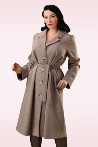 ”A whisper of warmth, wrapped in class and grace!” Deze mantel is exclusief bij Topvintage verkrijgbaar en niet alleen prachtig om te zien, maar ze houdt je ook nog eens heerlijk warm! Uitgevoerd in een luxueuze, ietwat dikkere, donkerbruine wolmix (stretcht niet) met een ruitjesmotief die volledig is gevoerd voor extra comfort. * A-lijn model * Dubbele knopenrij * Geheel gevoerd * Afneembare zwarte kraag van imitatiebont * Lange mouwen * Voorzien van zakken * Afneembaar striklint voor een ‘snatched’ taille * Valt over de knie bij een lengte van 1,70 m * Exclusief bij Topvintage verkrijgbaar